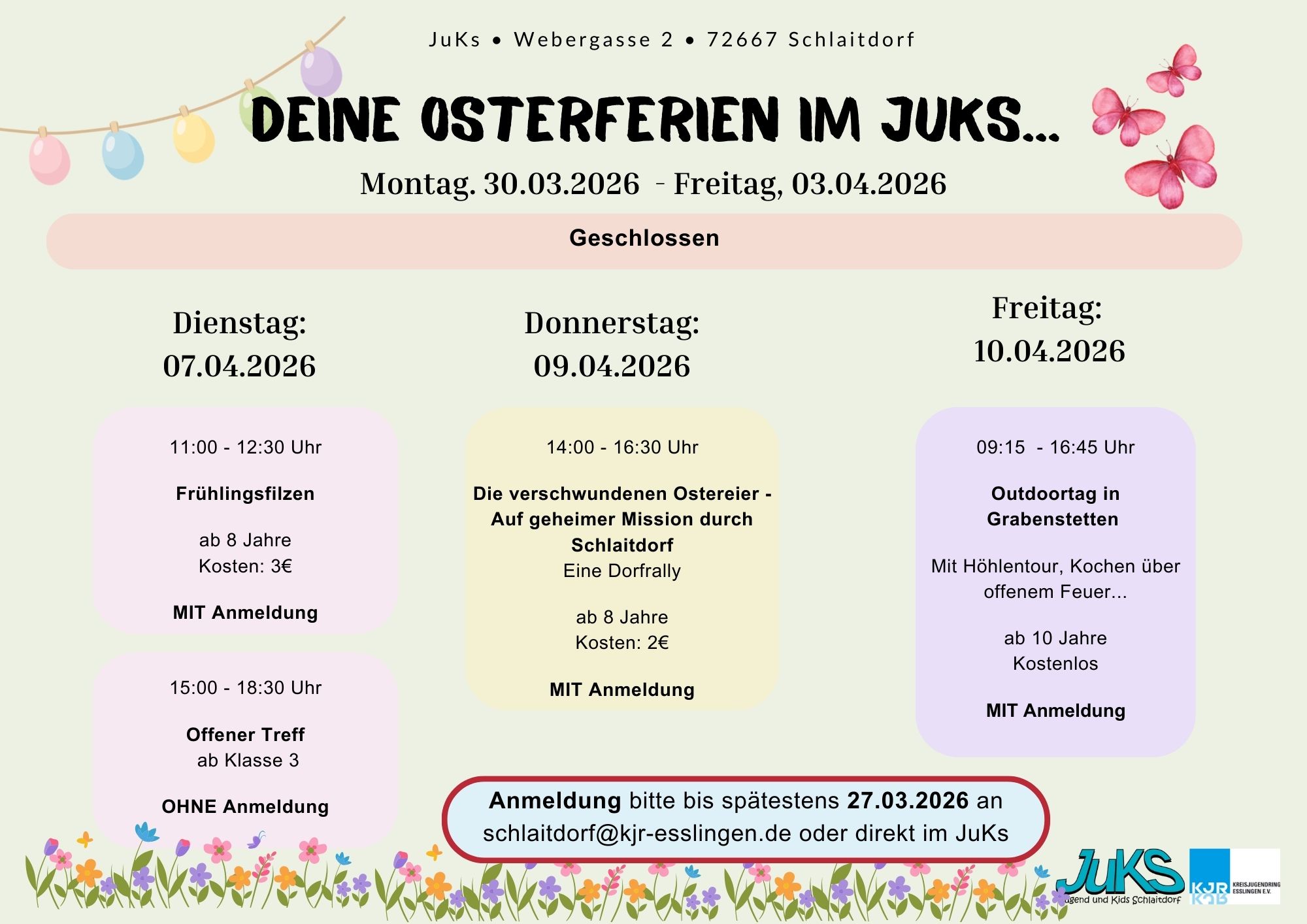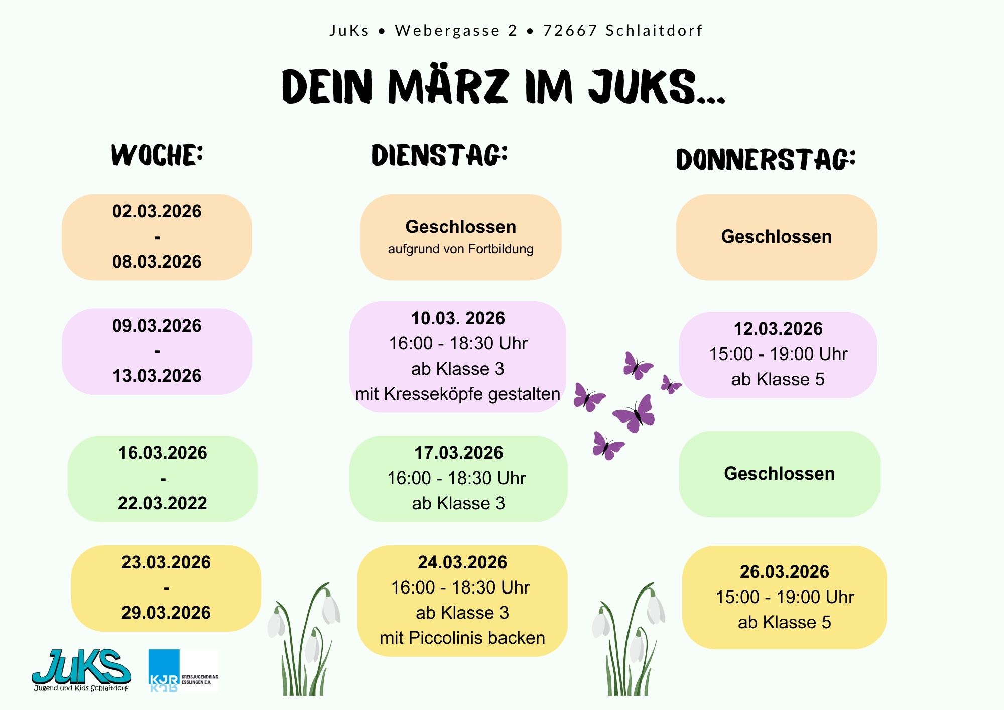 Geöffnet ist das JuKs jeden Dienstag von 16:00 - 18:30 Uhr für alle ab der 3. Klasse sowie alle zwei Wochen donnerstags von 15:00 - 19:00 Uhr für alle ab der 5. Klasse. In den Ferien können die Öffnungszeiten abweichen. Es finden Ferienaktionen statt, für welche überwiegend eine Anmeldung erforderlich ist.